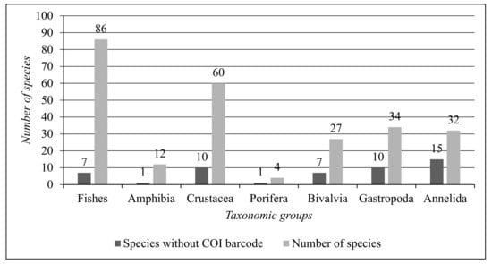 According to the results (Figure 6, Figure 7 and Figure 8), the most represented taxonomic groups are Fishes (86 species) and Crustacea (60 species). The taxonomic groups with the highest numbers of species without a COI DNA barcode are Annelida (15 species) and Gastropoda (10 species). The representative species of Amphibia are twelve, and the Amphibia species without a COI barcode is only one. Fishes have a low COI DNA barcode gap in the reference libraries, with only seven species out of eighty-six.