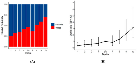 (A) Distribution of controls and cases in each decile; (B) ORs (points) with 95% CIs (vertical bars) by decile for melanoma cancer risk, using the 5–6th decile as the reference.
