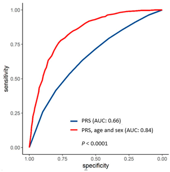 The univariate PRS57 model had an AUC of 0.66, which significantly increased to 0.84 when age at sampling and sex were included (Figure 3).