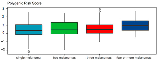 Box plot showing the different distributions between cases with one, two, three, or four or more melanomas. The bottom and the top of the box correspond to the first and third quartiles, and the bold-black line in the middle represents the median. The upper/lower whiskers extend to the largest/smallest value no further than 1.5× the inter-quartile range, or the distance between the first and third quartiles. Data beyond the end of the whiskers are outlying points.