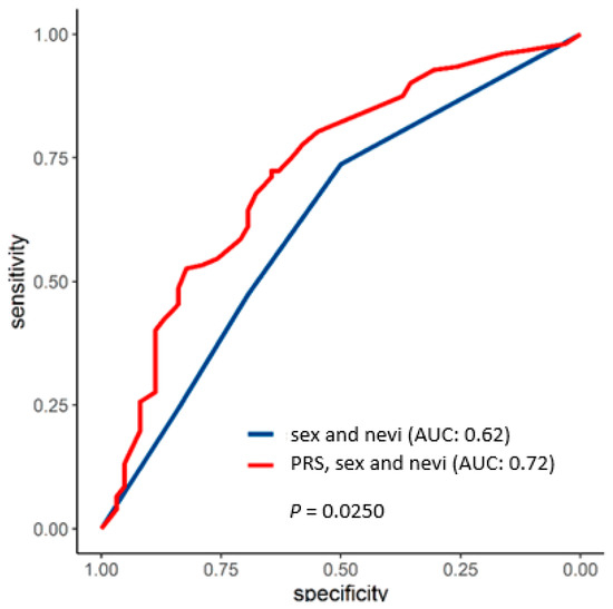 We also confirmed the nevus count as an important risk factor for the development of MPM. It is noteworthy that the PRS57, in addition to nevus count and sex, significantly improved the discrimination between SPM and MPM (AUC 0.62 vs. 0.72, p = 0.0250).