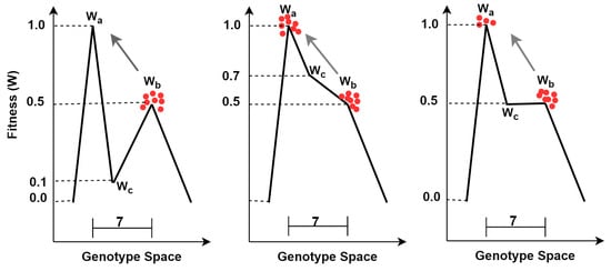 Figure 5). In other words, an organism can find the highest peak but fail to establish a majority despite its competitive advantage. This is notable because the organism at the highest peak has a fitness of