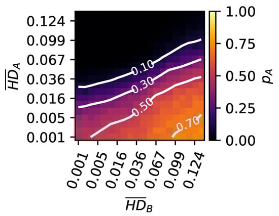Without further manipulation, one would expect the pioneer—having a fitness of —to easily outcompete the other organisms, which, in this experiment, all have the fitness of the lower peak set to , with the valley depth set to . We then artificially increase or decrease the mutational robustness (and thus the evolvability) of the starting organisms and perform competition experiments between all possible combinations of evolvable and robust organisms at both peaks (see Materials and Methods for details). Our previous findings suggest that an organism with high evolvability tends to find the highest peak first, while organisms with high mutational robustness remain at the secondary peak. This competition should significantly reduce the ability of a highly evolvable pioneer to form a majority. Conversely, if a mutationally robust organism is at the highest peak, it should have an elevated chance to outcompete more evolvable (less mutationally robust) organisms at the secondary peak.