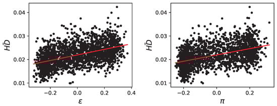 To support the notion that mutational robustness is conveyed by a reduction in pleiotropy and epistasis and that evolvability is conveyed by their increase, we generated random organisms and enriched the dataset with those who have a higher or lower and . For this dataset of 60,000 samples, we also measured the mean Hamming distance of mutations and correlated that to and .
