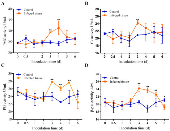 Effects of Diaporthe Z1-1N infection on activities of (A) PMG, Cx (B), PG (C), and β-glu (D) in rotted kiwifrui fruit. The asterisks indicate significant difference between control and Diaporthe Z1-1N-inoculated fruit (* p < 0.05, ** p < 0.01).