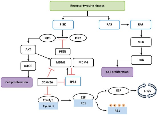 Figure 1. Simplified schematic representation of the PI3K/AKT/mTOR, RAS/RAF/MAPK, RB, and p53 pathways. RTKs activate two major pathways: the PI3K/AKT/mTOR and RAS/RAF/MAPK. PTEN inhibits the PI3K pathway, while TP53 and CDKN2A act as tumor suppressors, blocking cell cycle progression by inhibiting the Cyclin D-CDK4/6 complex and RB1-E2F activation.