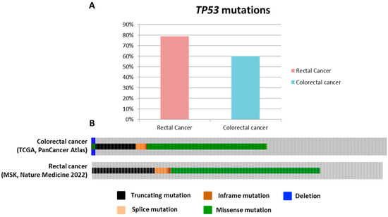 Figure 2. Comparison of TP53 mutation frequency and types in rectal versus colorectal cancer. (A) Frequency of TP53 mutations in rectal cancer compared to colorectal cancer. (B) Types of TP53 mutations observed in each cancer type. Data source: The Cancer Genome Atlas (TCGA), PanCancer Atlas, and MSK, Nature Medicine 2022—cBioPortal for Cancer Genomics.