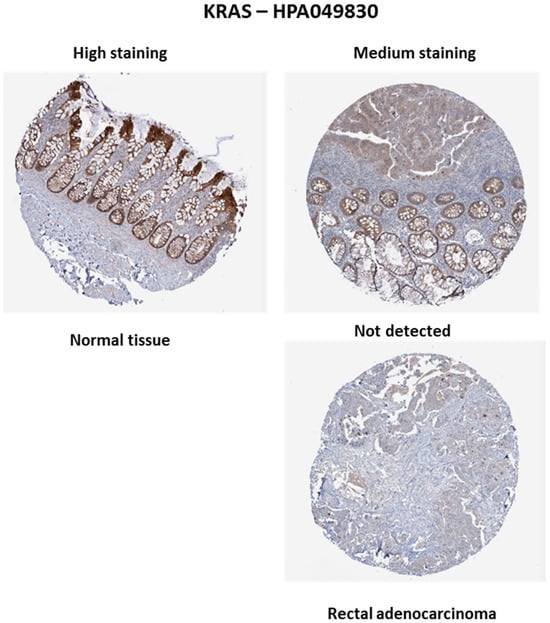 In contrast to BRAF mutations, KRAS alterations are frequently detected in RC. According to data from The Human Protein Atlas (https://www.proteinatlas.org/, accessed on 23 October 2024), KRAS staining was high in normal tissue but was either not detected or exhibited medium staining in rectal tumor tissue (Figure 4). These observations suggest that KRAS expression may be reduced or absent in tumor tissue. A study conducted by Jo et al. (2016) found that 43% of patients had KRAS mutations, with the majority occurring in codon 35 [41]. This finding is consistent with Chatila et al. (2022), who reported that 42% of patients had KRAS mutations [40].