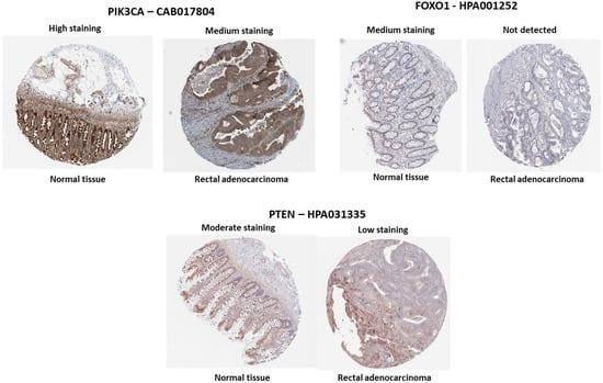 According to data from The Human Protein Atlas, analysis using the same antibody for evaluating protein expression revealed that PTEN exhibited low staining in RC tissue, indicating higher expression in normal tissue (Figure 5). In contrast, PIK3CA showed medium to high staining in both normal and tumor tissues (Figure 5). FOXO1 staining was medium in normal tissue but not detected to medium in rectal adenocarcinoma. These findings suggest potential loss of PTEN and FOXO1 expression in tumor tissue, which may contribute to disease development and progression. This is consistent with literature reports of PTEN gene alterations in rectal adenocarcinoma [44,45].