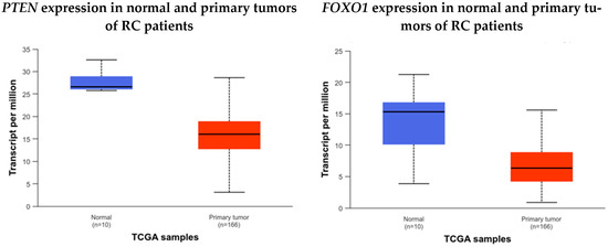 Data from TCGA, available on the UALCAN (https://ualcan.path.uab.edu/, accessed on 25 October 2024) platform, also indicate that PTEN and FOXO1 are highly expressed in normal tissue compared to tumor tissue (Figure 6—[46,47]).