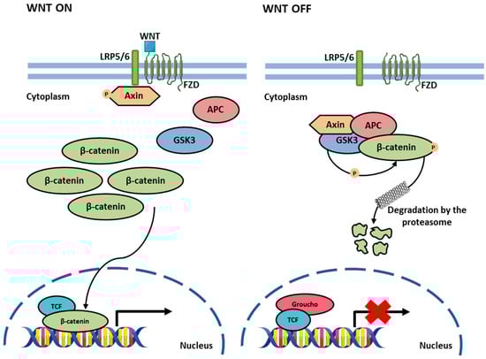 Figure 7. Wnt/β-Catenin Pathway. When the WNT ligands bind to the LRP5/6 and FZD (left), the phosphorylation and degradation of β-catenin are inhibited, and then β-catenin accumulates and translocates to the nucleus, where it partners with TCF to activate Wnt-responsive genes. In the absence of WNT ligands (right), cytoplasmic β-catenin forms a complex with several proteins, leading to proteasomal degradation. As a result, β-catenin levels remain low in the cytoplasm, inhibiting target gene transcription. Parts of the figure were drawn using Servier Medical Art licensed under a Creative Commons Attribution 3.0 Unported License.