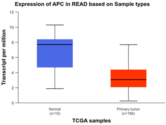 Zhang et al. (2020) identified APCR876* as a significant mutation hotspot in RC when compared to distal colon cancer [54]. Similarly, Bai et al. (2015) reported mutations in the CTNNB1 gene in RC, though at a lower frequency [55]. Notably, they also observed mutations in the APC gene in 16.5% of RC cases. Data from TCGA, available on the UALCAN platform, also indicates that APC gene expression is lower in RC when compared to normal samples (Figure 8—[46,47]).