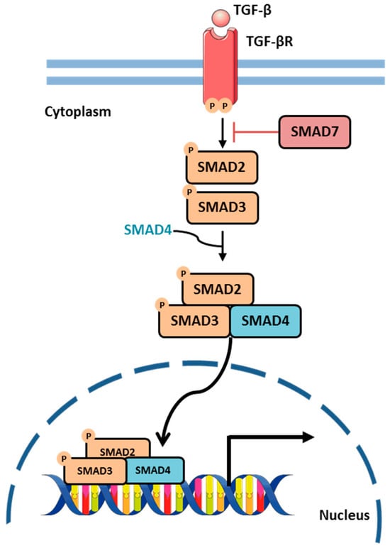The Transforming Growth Factor-β (TGF-β) signaling pathway is essential for regulating various cellular processes, including proliferation, differentiation, apoptosis, angiogenesis, and inflammation [56,57]. The TGF-β signaling pathway is initiated when TGF-β ligands bind to a heterotetrameric receptor complex. This complex phosphorylates a group of SMAD proteins, which serve as mediators of the pathway and are classified into three categories: receptor-regulated SMADs (R-SMADs), inhibitory SMADs (I-SMADs), and common-mediator SMADs (Co-SMADs). Phosphorylated R-SMADs form a complex with SMAD4, a Co-SMAD, and translocate to the nucleus, where they interact with various transcription factors to regulate the expression of target genes involved in cell cycle regulation, differentiation, and immune responses [57] (Figure 9). The TGF-β pathway is controlled by both positive and negative feedback mechanisms. I-SMADs, such as SMAD7, inhibit R-SMAD activation through binding to the TGF-β type I receptor, blocking downstream signaling [58].