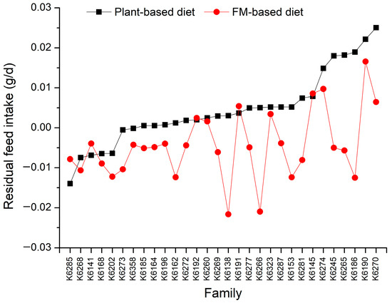 The variation in residual feed intake for 30 families under the plant-based and FM-based diet treatments.
