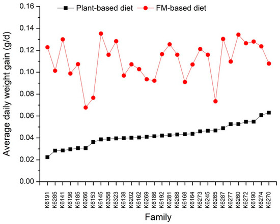 The variation in average daily weight gain for 30 families under the plant-based and FM-based diet treatments.