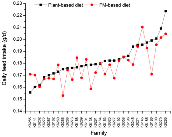The variation in daily feed intake for 30 families under the plant-based and FM-based diet treatments.