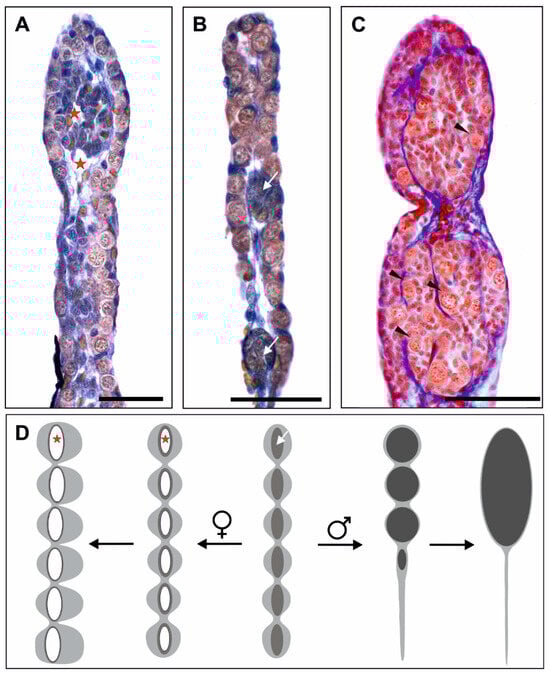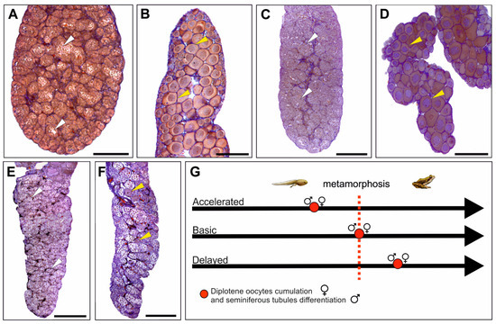 - Haczkiewicz, K.; Ogielska, M. Gonadal sex differentiation in frogs: How testes become shorter than ovaries. Zool. Sci. 2013, 30, 125–134. [Google Scholar] [CrossRef]