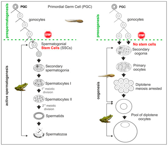 Ogielska, M.; Chmielewska, M.; Rozenblut-Kościsty, B. Pregametogenesis: The Earliest Stages of Gonad and Germline Differentiation in Anuran Amphibians. Biology 2024, 13, 1017. https://doi.org/10.3390/biology13121017