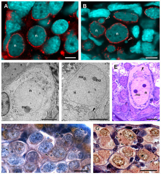 - Ogielska, M. Nucleus-like bodies in gonial cells of Rana esculenta [Amphibia, Anura] tadpoles—A putative way of chromosome elimination. Zool. Pol. 1994, 39, 461–474. [Google Scholar]