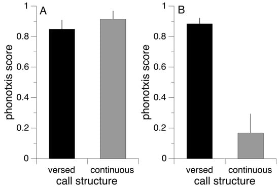 Average phonotaxis scores (± SEM) of female N. triops from (A) Puerto Rico (N = 9) and (B) Costa Rica (N = 10) to call stimuli structured in verses (black bars) or continuous (gray bars).