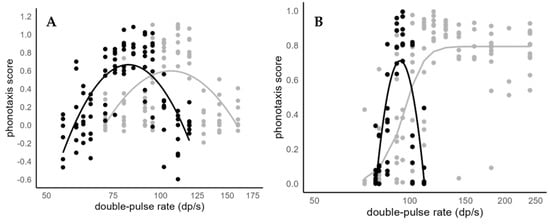 Phonotaxis scores of female N. triops from (A) Puerto Rico and (B) Costa Rica in response to varying double-pulse rate tested at 20 °C (black symbols and lines) and 25 °C (gray symbols and lines). The lines indicate the best-fit lines (see text) for the data distributions at each temperature.