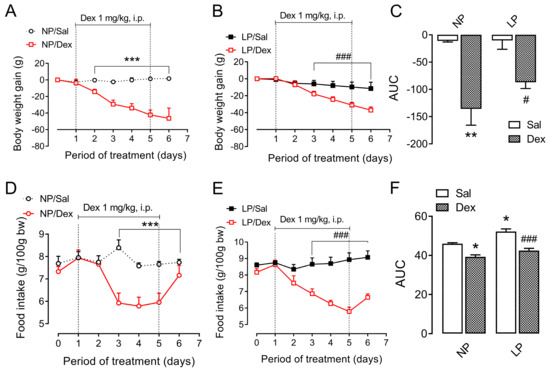 Body weight and food intake assessment throughout the chronic dexamethasone treatment. The data are presented as the means ± SEMs of 12 rats from 8 litters. Body weight evolution of NP (A) and LP (B) rats and food intake of NP (D) and LP (E) rats during dexamethasone treatment. The significant differences among the points in the curves (A,B,D,E) were analyzed via Student’s t test, and the values representing the area under the curve (AUC) for body weight (C) and food intake (F) were analyzed via one-way ANOVA, followed by Tukey’s post hoc test. * p < 0.05, ** p < 0.01 and *** p < 0.001 denote significant differences versus NP, and # p < 0.05 and ### p < 0.001 denote significant differences versus LP. NP, normal-protein diet; LP, low-protein diet.