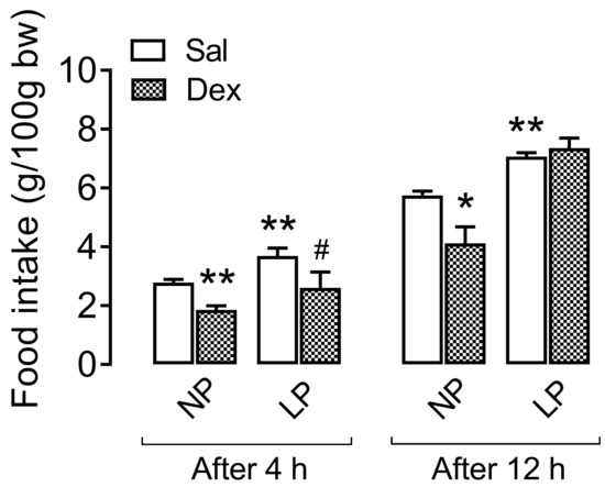 Ad libitum food intake during the dark cycle after icv injection of dexamethasone. The data are presented as the means ± SEMs of 12 h fasted (7:00 a.m.–7:00 p.m.) 8 rats obtained from 8 litters. The values were assessed 4 h (at 11:00 p.m.) and 12 h (at 7:00 a.m.) after saline or dexamethasone intracerebroventricular (icv) injection. The significant differences were analyzed with one-way ANOVA, followed by Tukey’s post hoc test, for 4 h and 12 h. * p < 0.05 and ** p < 0.01 denotes significant differences versus NP, and # p < 0.05 denotes a significant difference versus LP. NP, normal-protein diet; LP, low-protein diet.