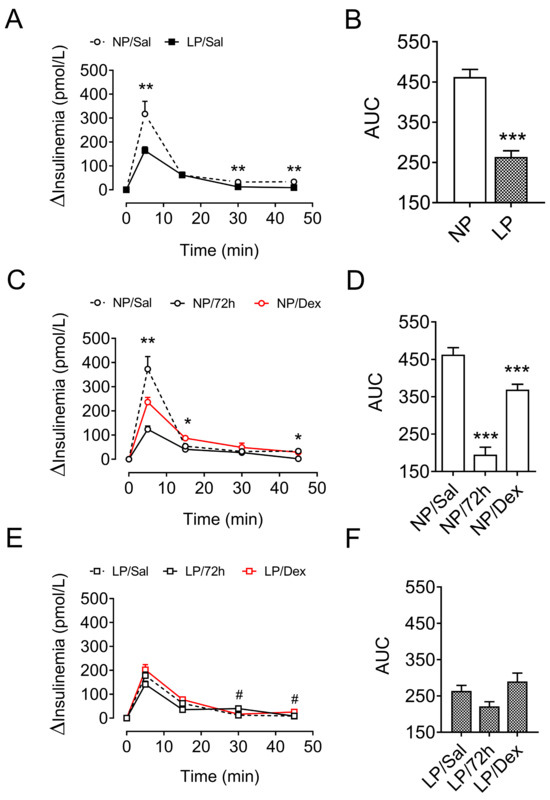 Variation in plasma insulin levels during the intravenous glucose tolerance test (ivGTT). The data are presented as the means ± SEMs of 8 rats from 8 litters. Plasma insulin levels of NP and LP rats without stress (A,B) and of NP (C,D) and LP (E,F) rats after 72 h of starvation and/or chronic dexamethasone challenge. The significant differences were analyzed with Student’s t test (A,B) or one-way ANOVA, followed by Tukey’s post hoc test (C–F). * p < 0.05, ** p < 0.01 and *** p < 0.001 denote significant differences versus NP/Sal rats, and # p < 0.05 denotes significant differences versus LP/Sal rats. NP, normal-protein diet; LP, low-protein diet.