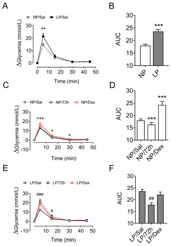 With respect to treatment with dexamethasone, glycemia increased 34.9% (p < 0.001, Figure 4C,D) during the ivGTT in the NP-treated rats compared with the glycemia of the 12 h fasted NP rats treated with saline. On the other hand, the increase in glycemia during the ivGTT in the LP rats treated with dexamethasone did not differ from the increase in glycemia observed in the 12 h fasted LP rats that did not receive dexamethasone treatment (p = 0.793, Figure 4E,F).