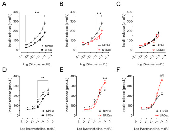 Insulin secretion from isolated pancreatic islets under the insulinotropic action of different glucose (5.6, 8.3, 11.1, 16.7, 20.0 and 24.0 mmol/L: (A–C)) and acetylcholine (0.1, 1.0, 10.0, 100.0 and 1000.0 µmol/L: (D,F)) concentrations. The symbols in the curves represent the means ± SEMs of insulin release from NP versus LP rats without stress challenges (A,D), from NP rats without stress challenges versus NP rats with chronic dexamethasone challenge (B,E) and from LP rats without stress challenges versus LP rats with chronic dexamethasone challenge (C,F). A pool of pancreatic islets (n = 32 islets) was obtained from 4 rats from 4 different litters in each experimental group. The significant differences between the groups for each glucose (A–C) and acetylcholine (D–F) concentration were determined by Student’s t test. ** p < 0.01 and *** p < 0.001 denote significant differences versus the NP/Sal group, and ### p < 0.001 denote significant differences versus the LP/Sal group. NP/Sal, NP rats treated with saline; NP/Dex, NP rats treated with dexamethasone; LP/Sal, LP rats treated with saline; LP/Dex, LP rats treated with dexamethasone. NP, normal-protein diet; LP, low-protein diet.