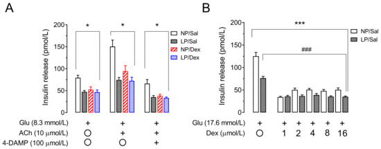 As expected, islets from LP rats that did not receive dexamethasone treatment were less responsive in terms of insulin secretion under increasing glucose concentrations (p < 0.001, Figure 5A) and increasing acetylcholine concentrations (p < 0.05, Figure 5D) than islets from NP rats were.