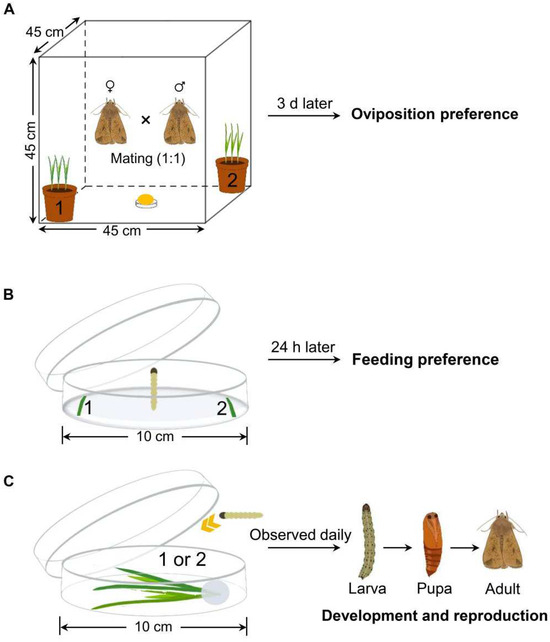 Schematic of the experimental method. (A) Oviposition preference, (B) feeding preference, and (C) development and reproduction of Mythimna separata.