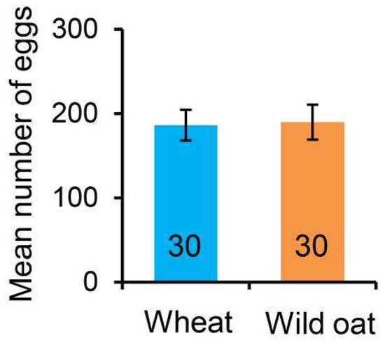 The mean number of eggs (±SE) laid by individual Mythimna separata females during a 3-day oviposition period when given a choice between wheat and wild oat. Numbers in the bars indicate sample sizes.