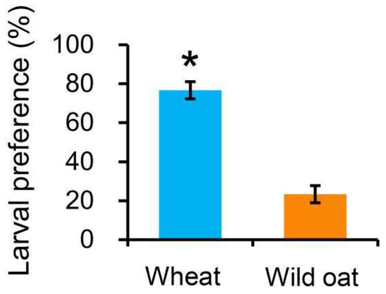 The percentage of newly hatched Mythimna separata larvae found on wheat or wild oat leaves after 24 h in a two-choice experiment. Values are means ± SE. Asterisk represents statistically significant difference between wheat and wild oat (p < 0.05).