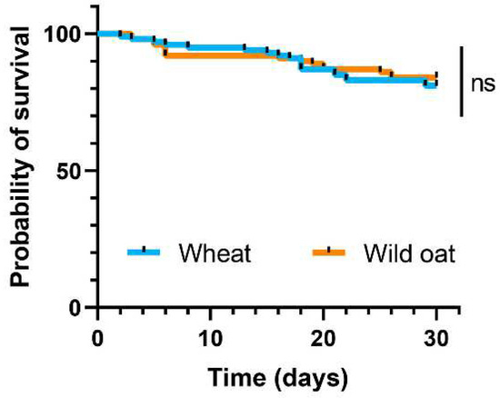 Survivorship of Mythimna separata larvae, shown as Kaplan–Meier estimates over 30 days, was compared using log-rank tests to assess the survival differences between larvae fed on leaves of wheat and wild oat. In the figure, ‘ns’ indicates a non-significant difference.
