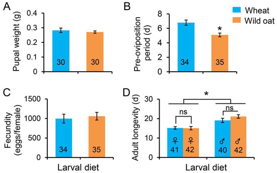 (A) Pupal weight, (B) pre-oviposition period, (C) fecundity, and (D) adult longevity of Mythimna separata fed leaves of either wheat or wild oat. Values are means ± SE. Asterisks represent statistically significant differences between treatments (p < 0.05), ‘ns’ indicates a non-significant difference. Numbers in the bars indicate sample sizes.