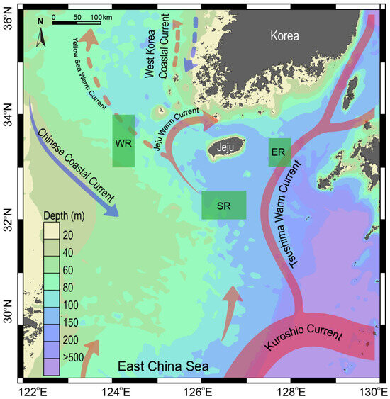 This study was conducted on the outer shelf off the coast of Jeju Island in the SSK (Figure 1). The SSK is characterized by a complex hydrographic system with highly seasonal dynamics [23]. As previously described, the study area includes three sampling sites with contrasting water-column structures. The western area (WR) is located on a shallow continental shelf (~60 m depth) and is influenced by the weak Yellow Sea warm current and the Chinese coastal current (Figure 1). This area receives cooler, low-salinity seawater from the CDW, particularly following the summer monsoon from the southwest [25,32]. In contrast, the eastern (ER) and southern areas (SR) are characterized by deeper water masses (100–200 m depth). They are influenced by warm, saline, and oligotrophic waters from the TWC [26]. The influence of the TWC is strongest in summer and gradually diminishes during winter. Chlorophyll a concentration in the region ranges from less than 0.4 to approximately 0.4 mg m−3 during spring [33] and from 0.2 to 0.3 mg m−3 during summer (https://www.meis.go.kr, accessed on 15 November 2024). Primary production, phytoplankton biomass, and particulate organic carbon concentrations decrease progressively from the western basin towards the Kuroshio current region [34]. Given the contrasting environmental conditions across seasons and locations, sampling was conducted in the spring (April–May) and summer (August) of 2018 in the three regions (WR, ER, and SR) off the coast of Jeju Island (Figure 1).