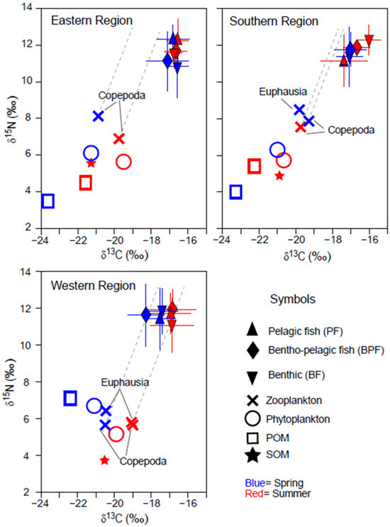 Bi-plots of δ13C and δ15N values of organic matter sources (phytoplankton, suspended particulate organic matter [POM], and sedimentary organic matter [SOM]) and consumers collected in spring and summer in three areas off the coast of Jeju Island in the Southern Sea of Korea/northern East China Sea. Consumers were categorized based on their primary feeding zone (pelagic, benthopelagic, and benthic). The horizontal and vertical bars represent the standard deviation. The dotted grey lines represent trophic enrichment factors (1.3‰ and 3.3‰ in δ15N and δ13C per trophic level).