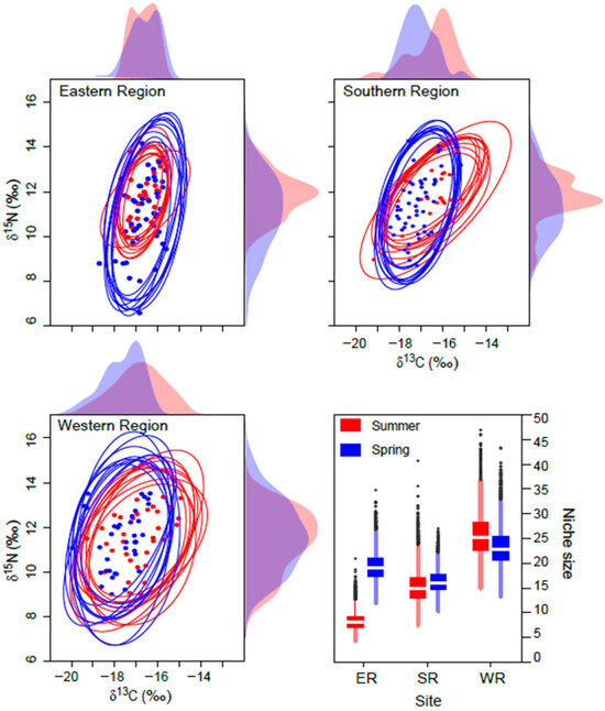 A multivariate analysis confirmed significant differences in consumer δ13C values across areas (PERMANOVA, Pseudo-F2,217 = 11.178, p < 0.001) and between seasons (Pseudo-F1,217 = 8.796, p = 0.003) (Table 1a). Pairwise comparisons revealed a notable distinction in δ13C values between the ER and WR regions (Table 1b). Although the interaction effects among region, season, and feeding-zone group combinations were not statistically significant (PERMANOVA, Pseudo-F2,217 = 1.548, p = 0.192), a more pronounced seasonal difference was observed in the WR (Figure 2). There were also significant differences in δ13C values among feeding-zone groups (pelagic, benthic–pelagic, and benthic feeders) (Pseudo-F2,217 = 5.748, p = 0.015), with pelagic fish showing significantly different δ13C values compared with benthic groups (Table 1b). In contrast, δ15N values of consumers showed no significant variation across areas (PERMANOVA, Pseudo-F2,217 = 0.0495, p = 0.613), seasons (Pseudo-F1,217 = 2.457, p = 0.117), or feeding-zone groups (Pseudo-F2,217 = 0.702, p = 0.504) (Table 1c).