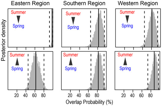 Posterior distribution of the probabilistic niche overlap (%) between consumer’s niche (NR of 95%) of two seasons from the Southern Sea of Korea. The vertical solid lines represent posterior means and dotted lines represent 95% CI. The arrows indicate the directions of niche overlaps between the communities.