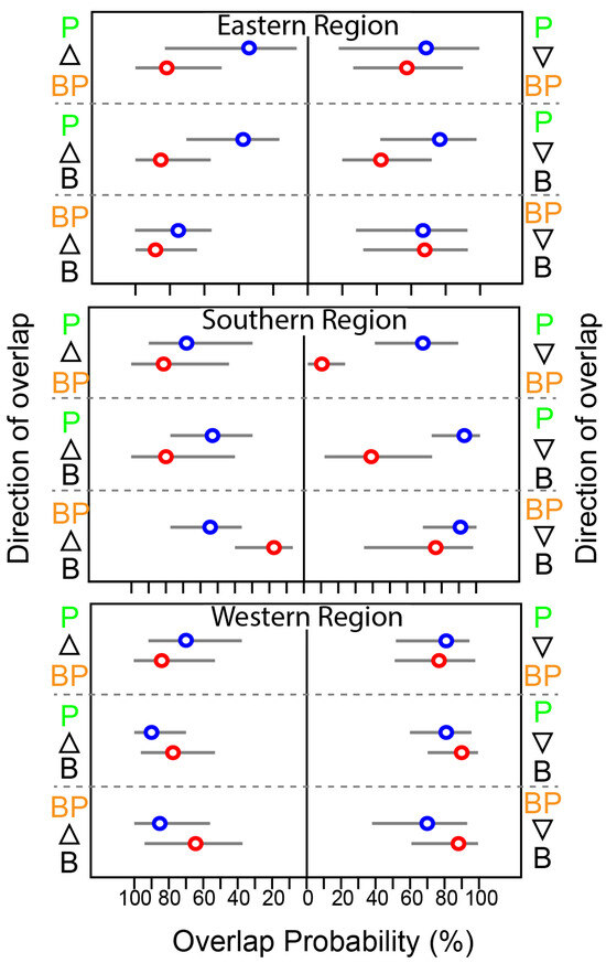 Seasonal variation in the probabilistic niche overlap (%) among the isotopic niche (NR of 95%) of three groups of consumers from the Southern Sea of Korea. The circles represent the posterior mean overlap (%), and the horizontal lines represent the 95% CI. P, B, and BP stand for pelagic, benthic, and benthopelagic consumers, respectively.
