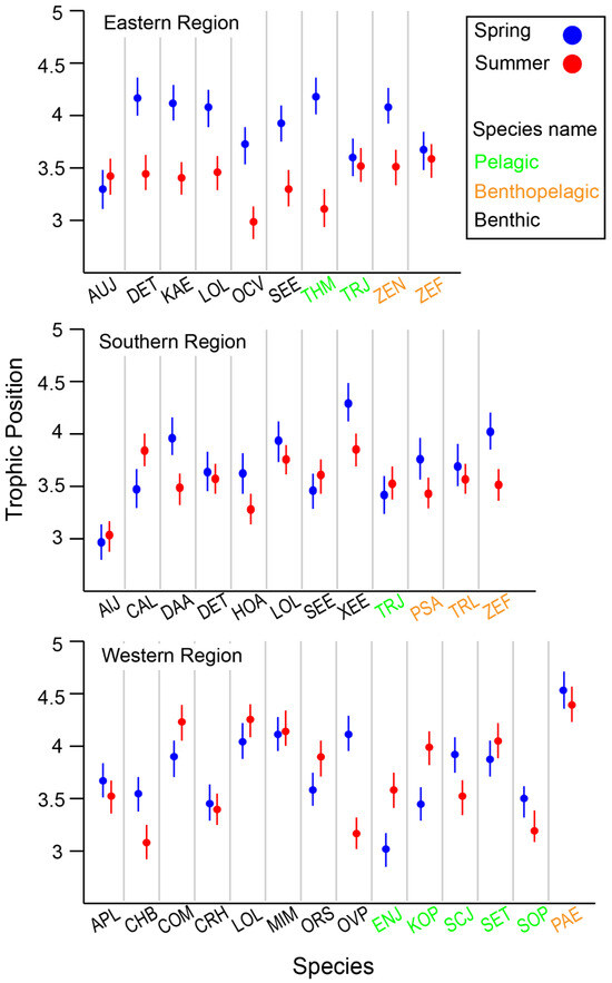 When comparing species collected in both seasons within each area, species-specific seasonal variation in TPs was observed, with the variation differing across locations (Figure 6). Overall, benthic consumers in the deeper ER and SR areas had lower TPs in summer compared with spring. In contrast, many benthic consumers exhibited lower TPs in the shallower WR in spring. Benthic–pelagic fish generally showed an increase in TP during spring across all areas, although this observation was not fully conclusive due to limited data availability (fewer than three cases). Among pelagic consumers, seasonal changes in TP were highly variable between species, with no clear patterns emerging.
