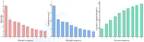 Figure 2). Ten principal components were extracted, with eigenvalues of 6.051, 3.372, 2.918, 2.789, 2.253, 1.926, 1.546, 1.320, 1.171, and 1.025. The variance contribution rates for these components were 19.521%, 10.878%, 9.413%, 8.997%, 7.268%, 6.213%, 4.987%, 4.257%, 3.777%, and 3.306%. The cumulative variance contribution rate was 78.618%, indicating that the first 10 components sufficiently represented the majority of the information contained in the original variables.