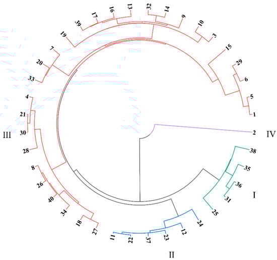 Figure 3). The 40 alfalfa germplasm varieties were divided into four categories: Category I (green) included five germplasm varieties classified as highly cold-resistant, namely ‘Baimu 202’, ‘WL168HQ’, ‘Zhongmu No. 1’, ‘Gongnong No. 1’, and ‘Legacy’. Category II (blue) included six germplasm varieties classified as moderately cold-resistant. Category III (red) included twenty-eight germplasm varieties classified as slightly cold-resistant. Category IV (purple) included one germplasm variety (‘3010’) classified as non-cold-resistant.