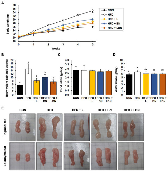 Effects of Lactobacillus mixture and banaba leaf extract on the body masses of high-fat diet-fed mice. (A) Body masses of the mice each week. (B) Body mass gain for experimental duration. (C) Food intake per day. (D) Water intake per day. (E) Macroscopic images of the inguinal and epididymal fat depots. CON, chow diet-fed control mice; HFD, high-fat diet-fed obese mice; HFD + L, HFD-fed mice treated with 108 CFU/kg/day of Lactobacillus HY7601 and KY1032; HFD + B, HFD-fed mice treated with 27 mg/kg/day of banaba leaf extract; HFD + LBN, HFD-fed mice treated with 108 CFU/kg/day of the Lactobacillus mixture and 27 mg/kg/day of the banaba leaf extract. Data are mean ± SD. Different letters indicate significant differences (p < 0.05): a > ab > b > c.