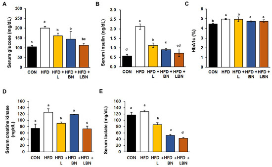 Effects of the Lactobacillus mixture and the banaba leaf extract on serum parameters. (A) Serum glucose concentration. (B) Serum insulin concentration. (C) HbA1c level. (D) Creatine kinase activity. (E) Lactate concentration. Con, chow diet-fed control mice; HFD, high-fat diet-fed obese mice; HFD + L, HFD mice treated with 108 CFU/kg/day of HY7601 and KY1032; HFD + B, HFD mice treated with 27 mg/kg/day of banaba leaf extract; HFD + LBN, HFD mice treated with 108 CFU/kg/day of Lactobacillus and 27 mg/kg/day of banaba leaf extract. Data are mean ± SD. Different letters indicate significant differences (p < 0.05): a > b > bc > c > cd > d.