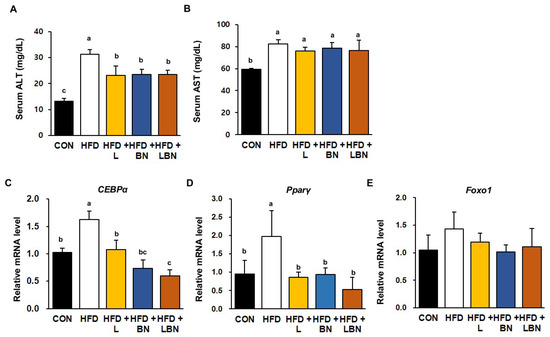 Effects of the Lactobacillus mixture and the banaba leaf extract on serum liver enzyme activities and hepatic adipogenic gene expression. Serum activities of (A) ALT and (B) AST. Relative hepatic mRNA expression of (C) CEBPα and (D) PPARγ (E) Forkhead box protein O1 (Foxo1). Con, chow diet-fed control mice; HFD, high-fat diet-fed obese mice; HFD + L, HFD mice treated with 108 CFU/kg/day of HY7601 and KY1032; HFD + B, HFD mice treated with 27 mg/kg/day of banaba leaf extract; HFD + LBN, HFD mice treated with 108 CFU/kg/day of the Lactobacillus mixture and 27 mg/kg/day of the banaba leaf extract. Data are mean ± SD. Different letters indicate significant differences (p < 0.05): a > b > bc > c.