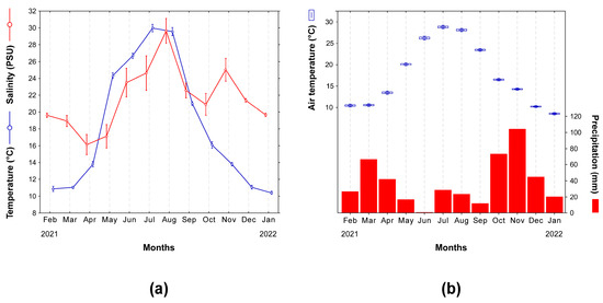 Figure 2. (a) Variation in mean (±1SE, n = 4) water temperature (°C) and salinity (PSU) in the study area during the investigation. (b) Air temperatures (°C) and precipitations (mm) measured at the ARPA-Puglia climatic station located in the city of San Severo (FG, Italy) during the study period. See the text for additional details. Air temperatures are expressed as monthly means of hourly measurements ± 1SE (boxes); whiskers are 95% confidence intervals. Precipitation data are cumulated at a monthly scale.