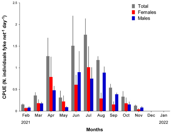 Figure 3. Variation in mean (±1SE, n = 4) monthly catches per unit effort (CPUE, measured as N. individuals fyke nets−1 d−1) of blue crabs determined during the investigation. CPUE values are reported for sexes combined and for the two sexes separately.