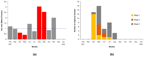 Figure 4. (a) Sex ratio of blue crabs captured during the investigation. The blue dashed line identifies the 1:1 ratio. Red bars indicate significant departures from a 1:1 ratio (χ2 test, p < 0.05 after correction for multiple tests) indicated by the blue dashed line. Statistical results for February and November 2021 should be considered with caution given the low number of total specimens collected (<10). (b) Number of ovigerous females at three color-determined egg stages (stage 1 = yellow; stage 2 = brown; stage 3 = black) captured during the investigation.